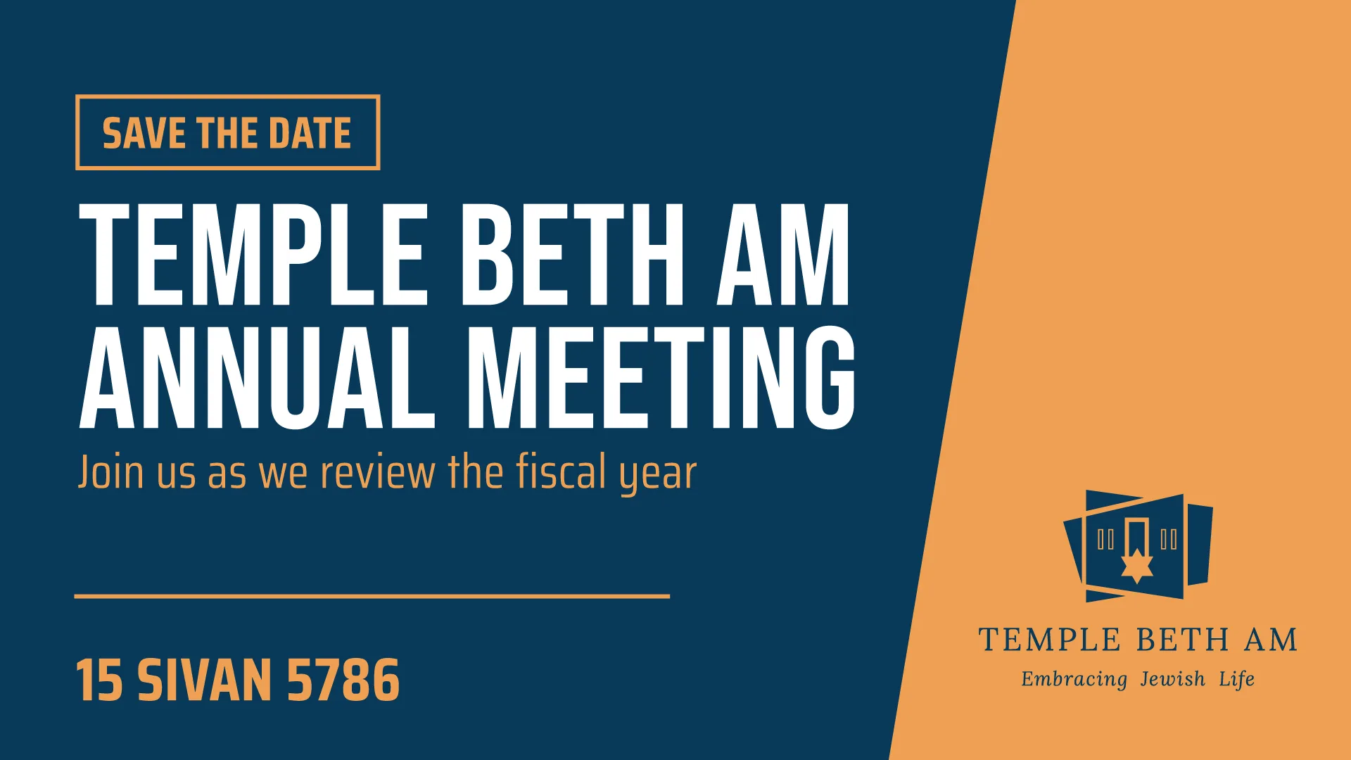 Temple Beth Am Annual Meeting SAVE THE DATE Join us as we review the fiscal year + Add to Google Calendar + iCal / Outlook export 00 days 00 hours 00 minutes 00 seconds Date Sunday, May 31 2026 Location Sanctuary Lewis Family Religious Life Complex Category Featured Major Featured Programs